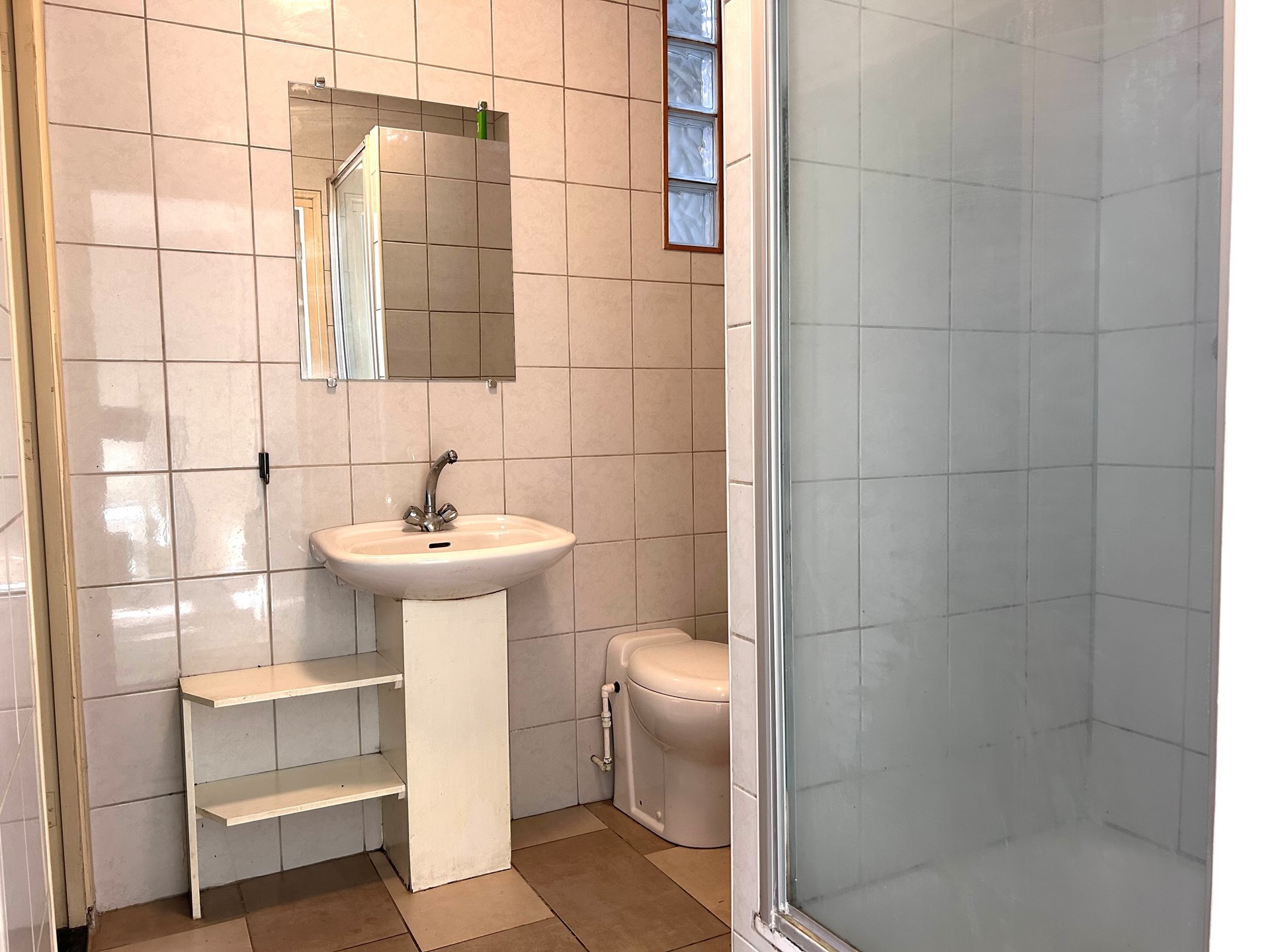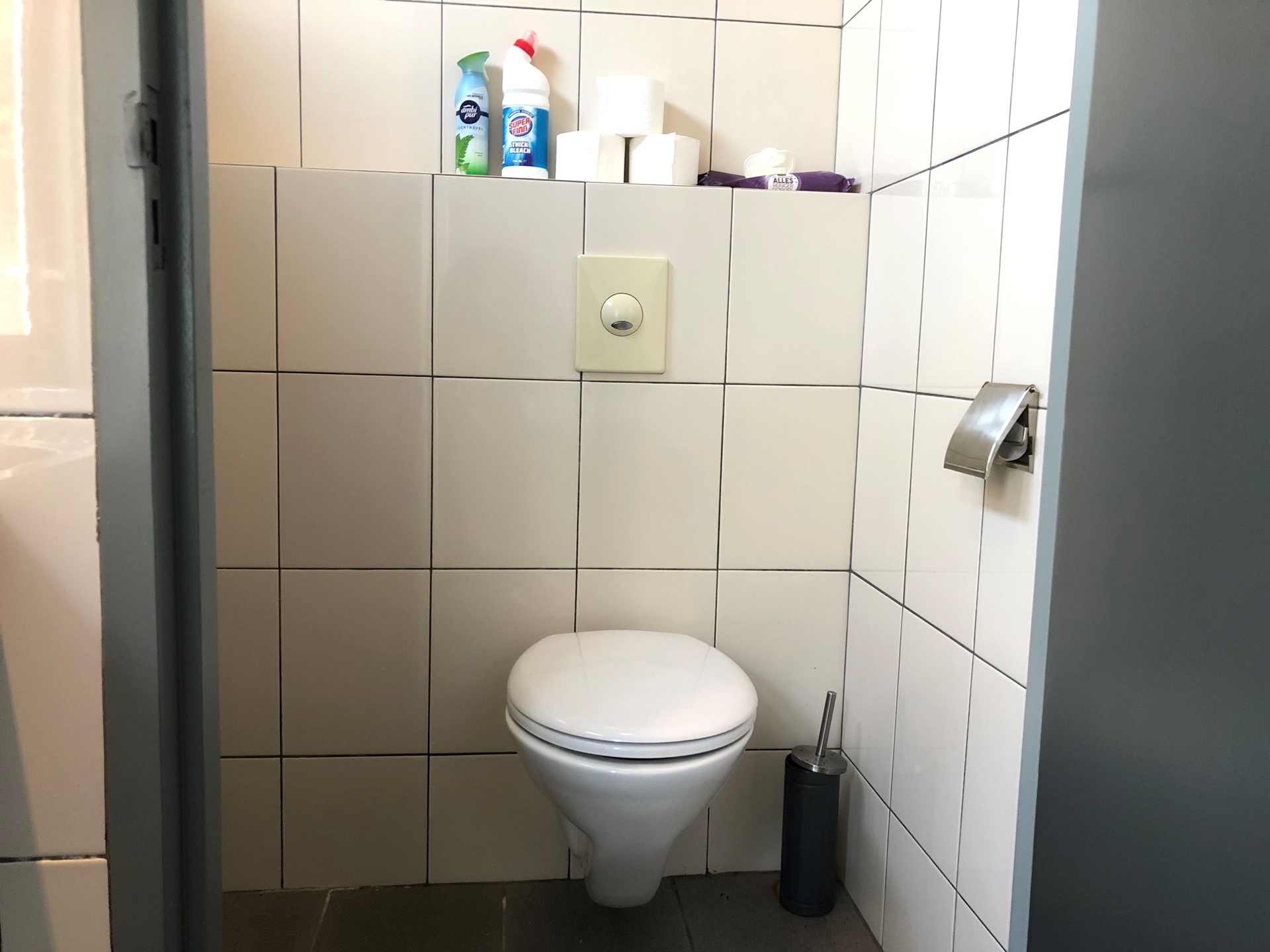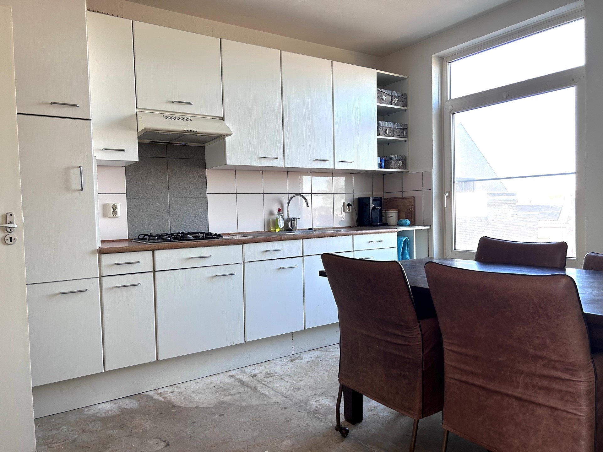 Winkelruimte met keuken en sanitair. Via een aparte ingang is de hal met de trapopgang naar de 2 appartementen bereikbaar.