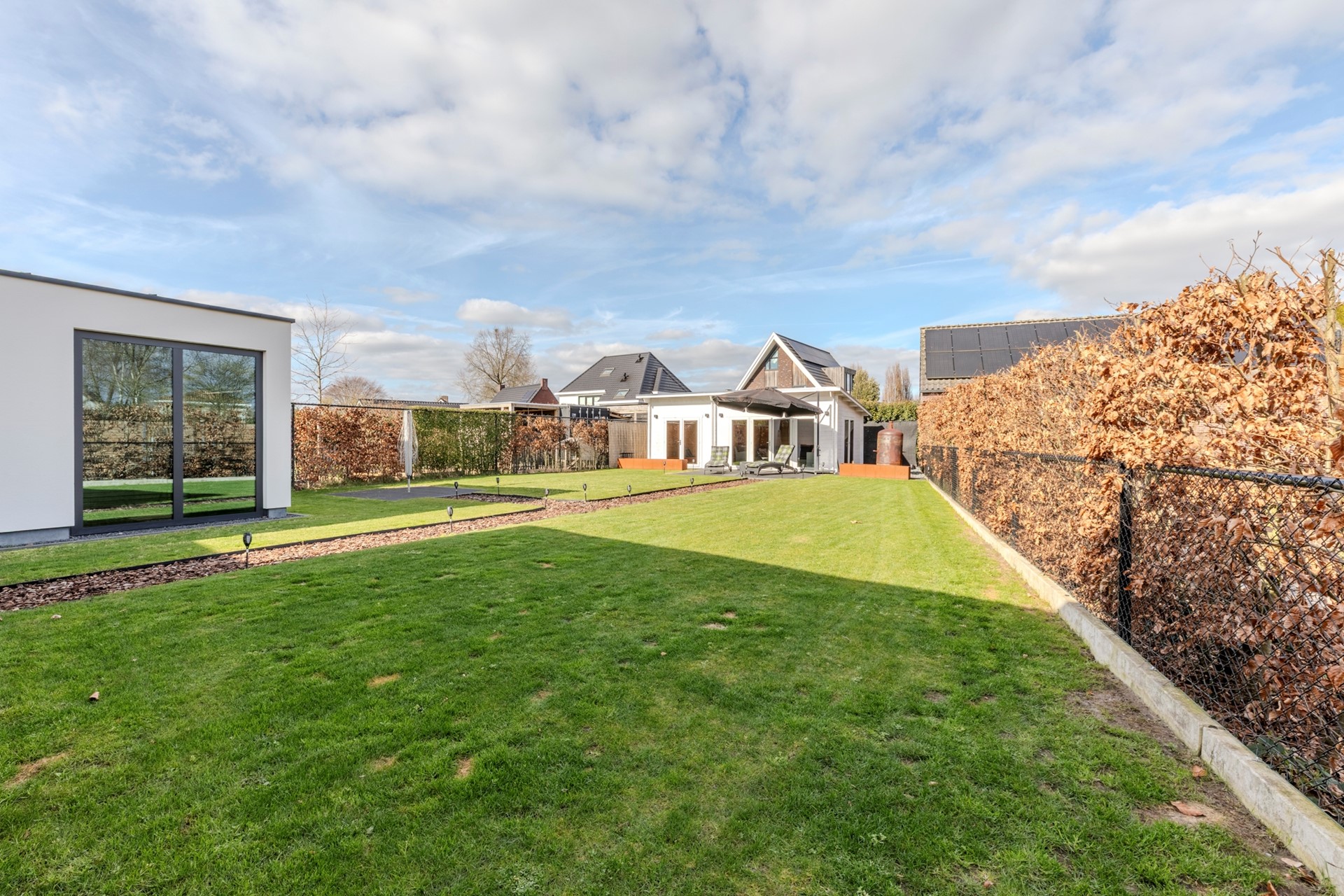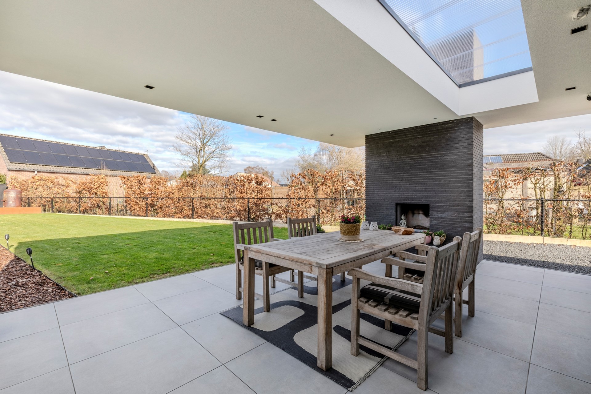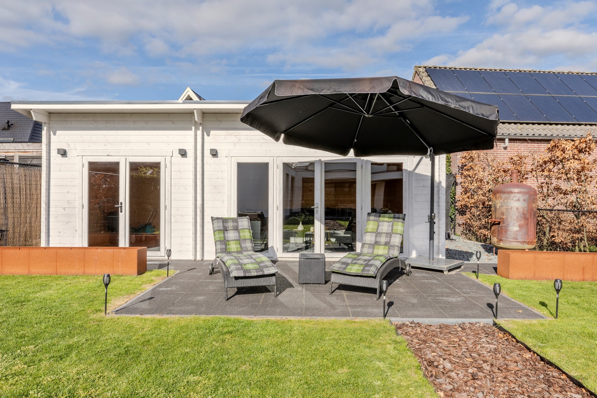 De tuin is keurig aangelegd en beschikt over een groot overdekt terras met sfeervolle open haard en lichtstraat, groot gazon, houten tuinhuis met terras en een brede achterom met dubbele poort.