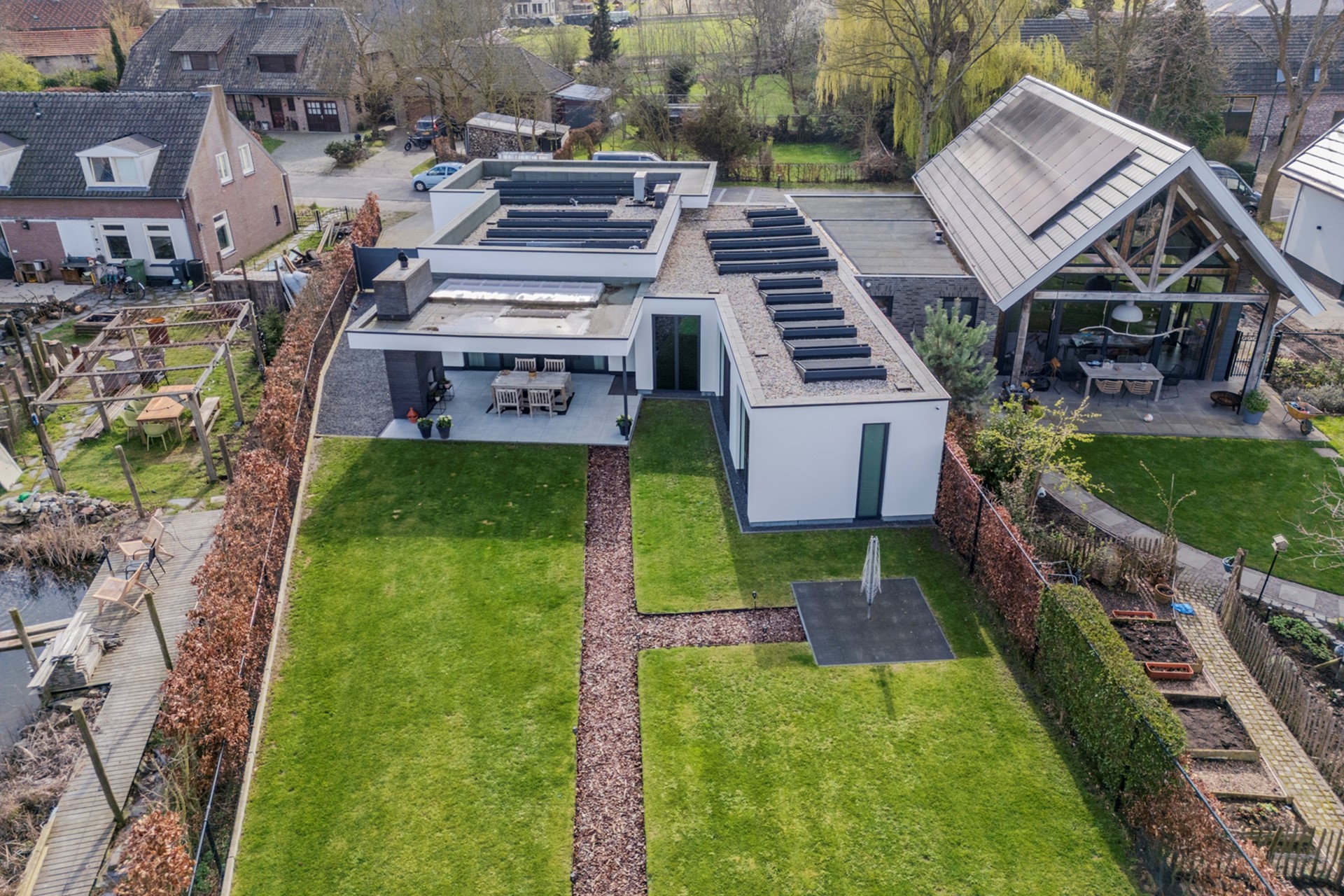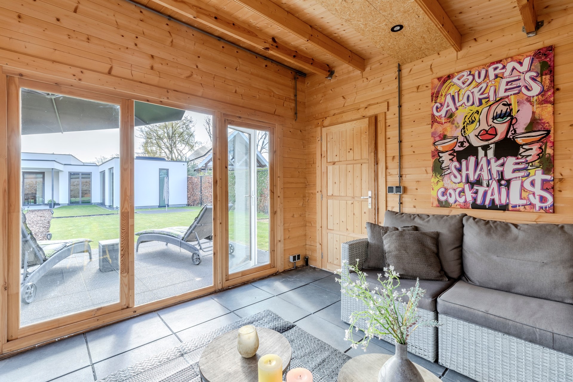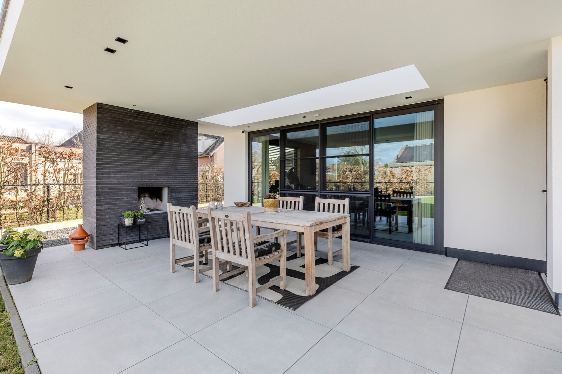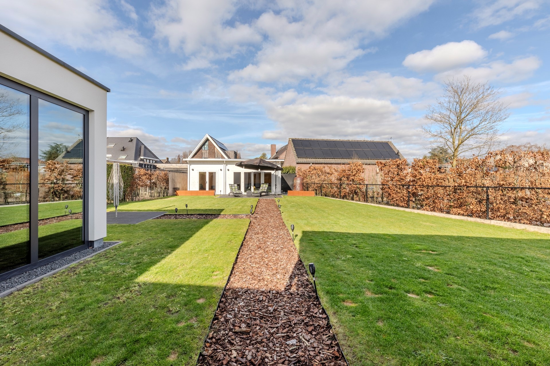 De tuin is keurig aangelegd en beschikt over een groot overdekt terras met sfeervolle open haard en lichtstraat, groot gazon, houten tuinhuis met terras en een brede achterom met dubbele poort.