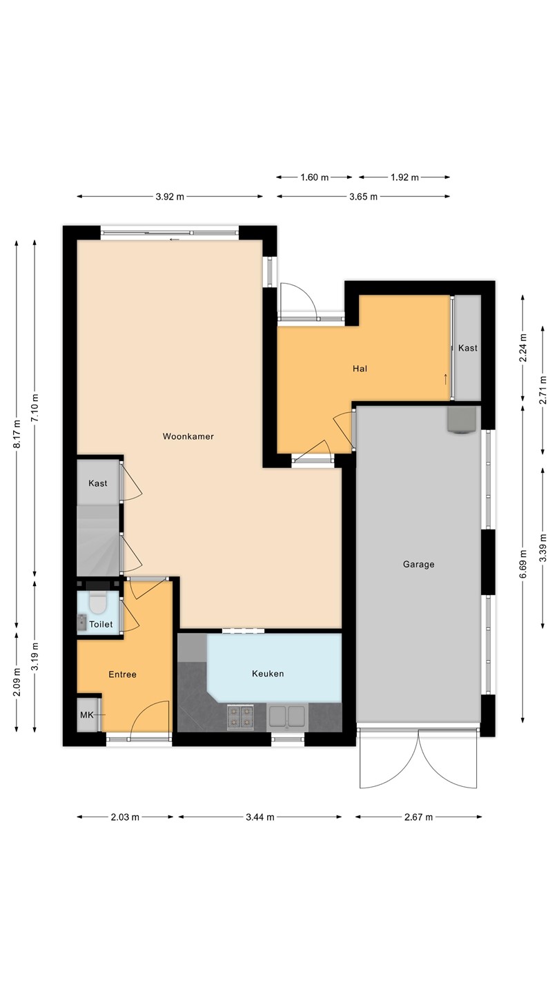 Hal met meterkast; moderne, geheel betegelde toiletruimte met wandcloset en fonteintje; gezellige tuingerichte woonkamer met zit- en eethoek. Vanuit de woonkamer heb je via een schuifpui direct toegang tot de tuin; trapkast; door een deur af te sluiten trapopgang naar de 1e verdieping; halfopen keuken v.v. een keukeninrichting met inbouwapparatuur; werkkamer v.v. inbouwkast; garage / berging met witgoedaansluitingen en een handige vliering.