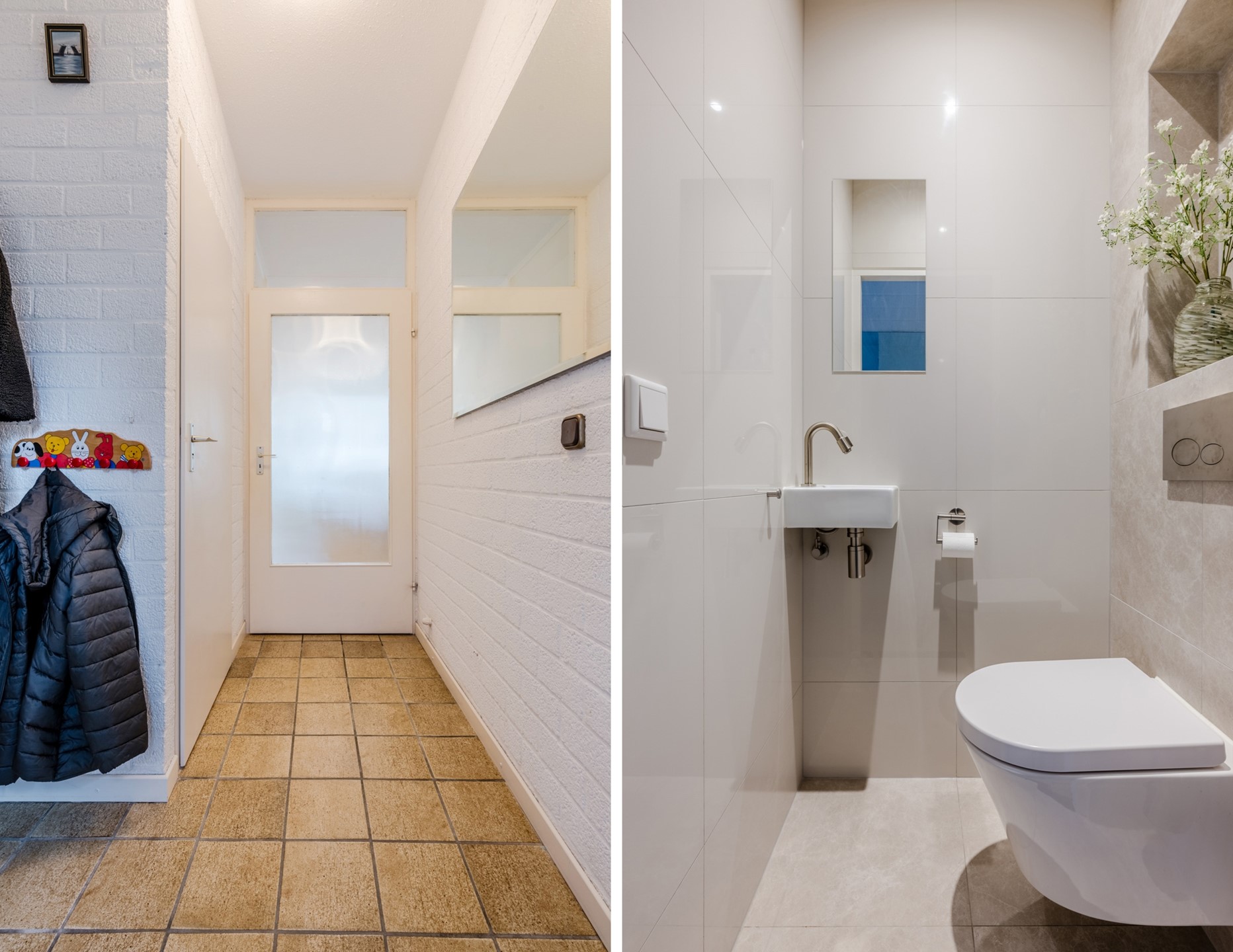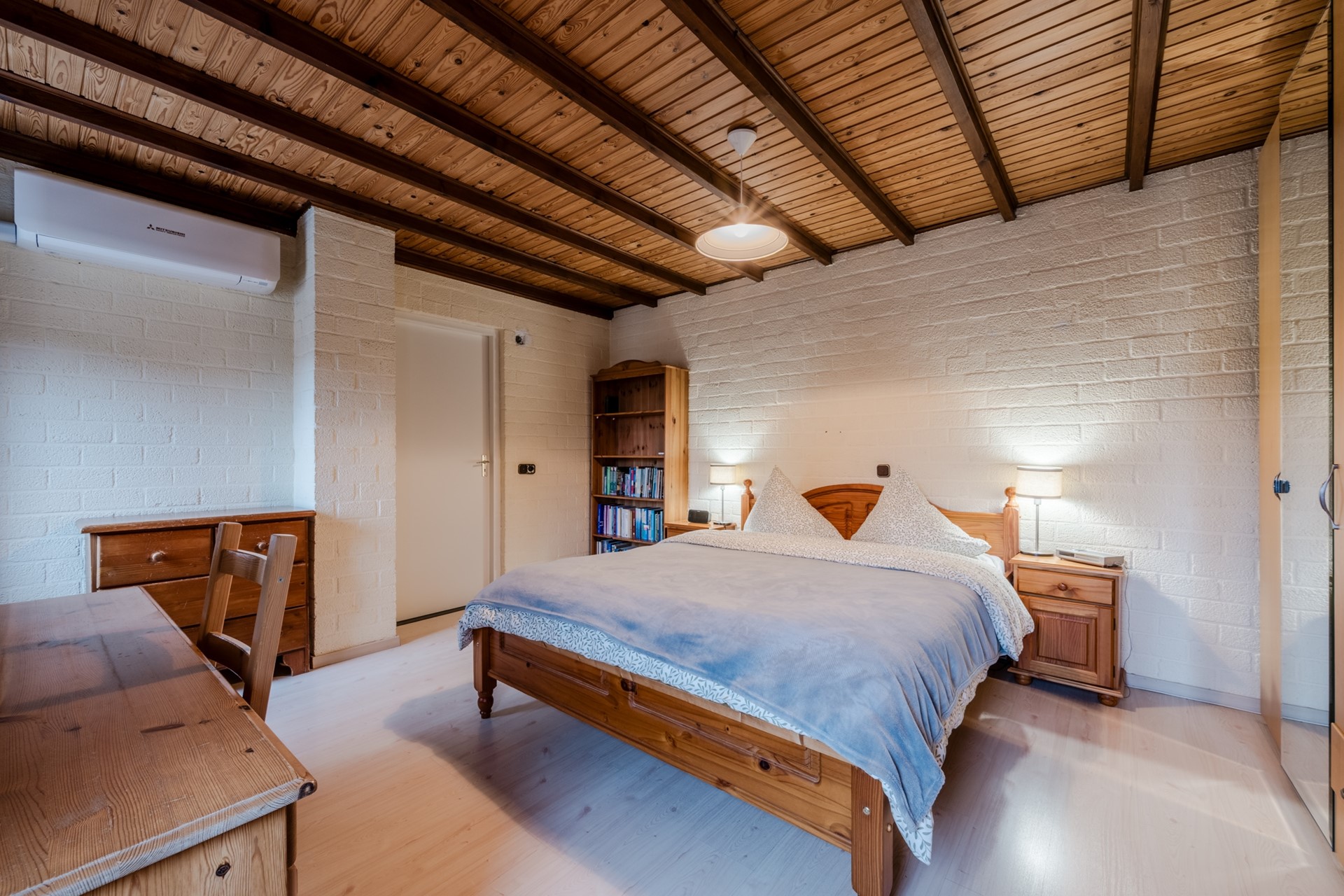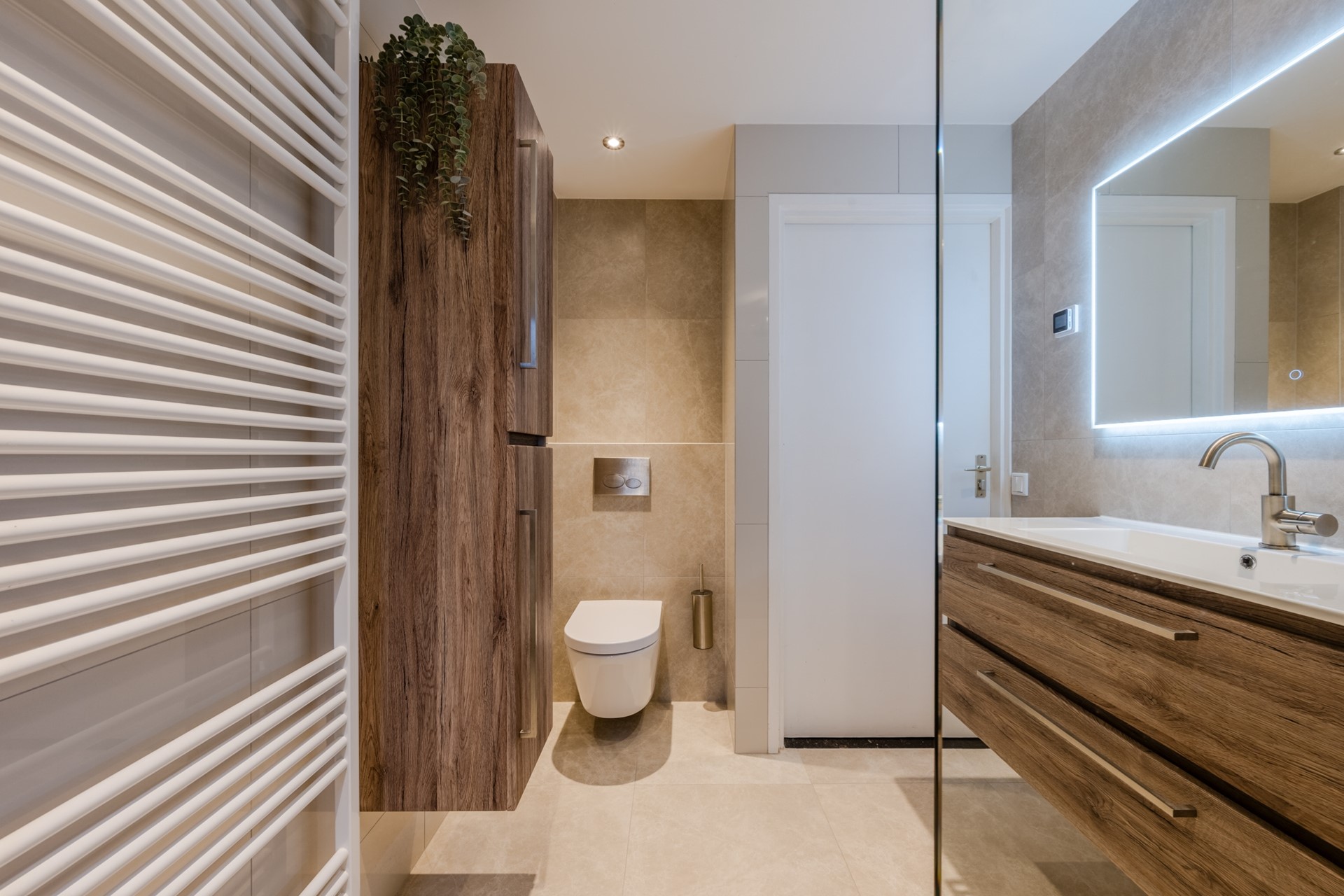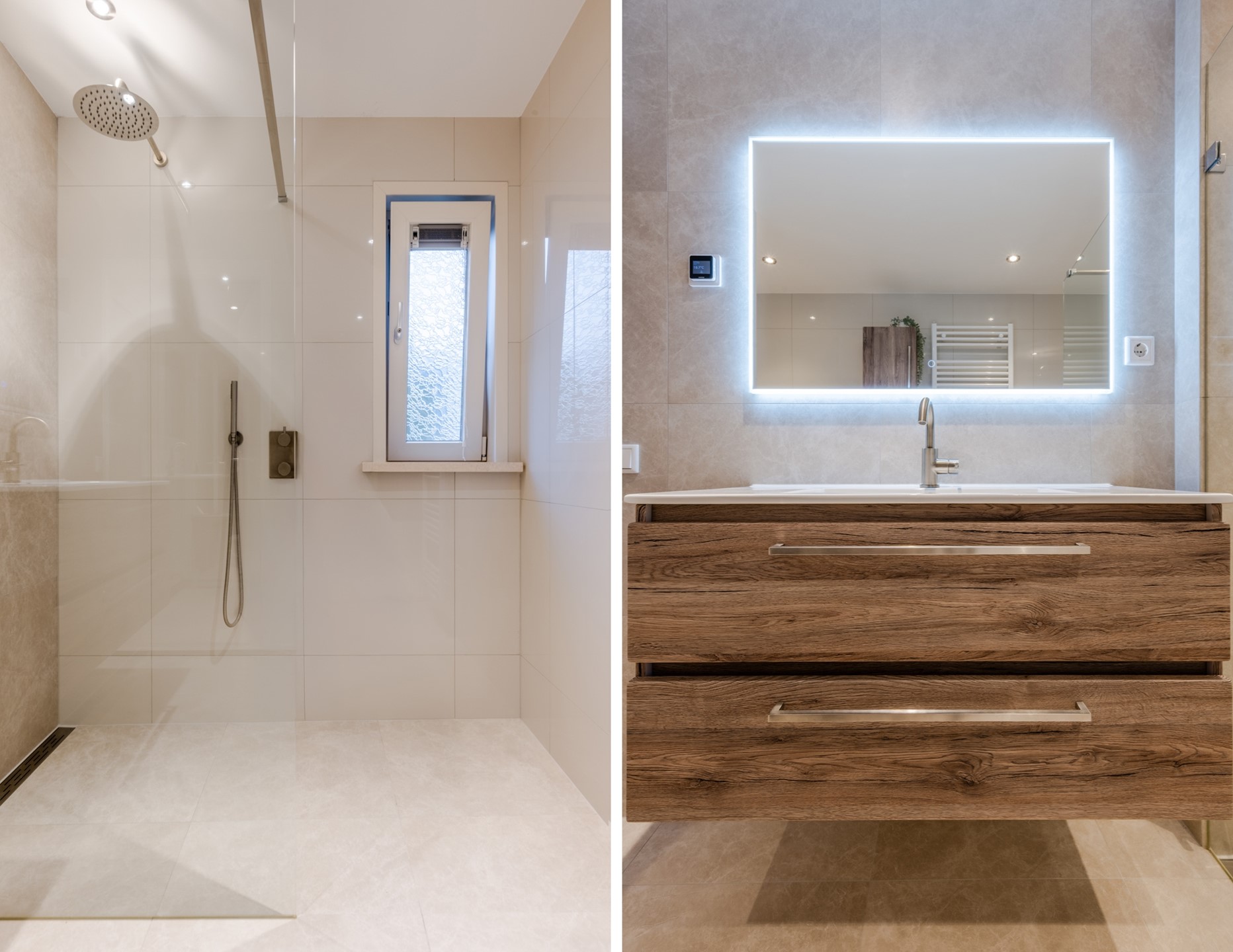 Overloop met trapopgang naar de 2e verdieping; 3 slaapkamers; moderne, geheel betegelde badkamer met ruime inloopdouche, meubel met wastafel, handdoekenkast en een wandcloset. De handdoekradiator en de elektrische vloerverwarming zorgen voor de nodige comfort.