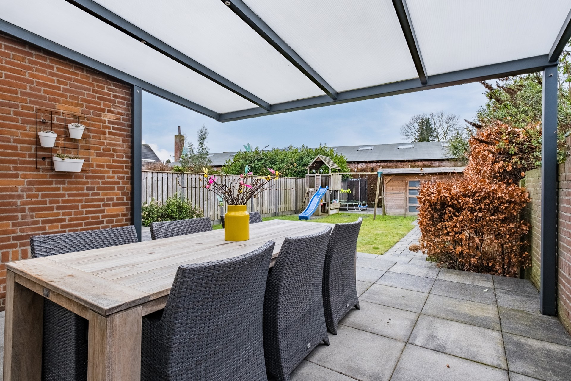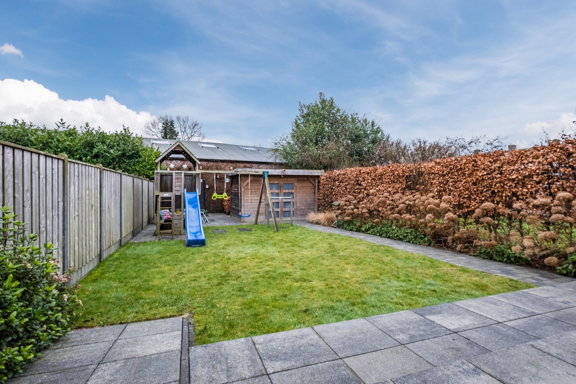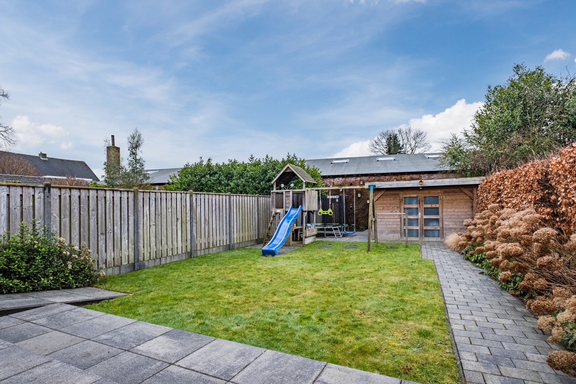 Een wat een privacy biedt de op het zuidwesten gelegen achtertuin! Aangelegd met gazon, bestrating, borders en een houten tuinhuis ideaal voor gezinnen.