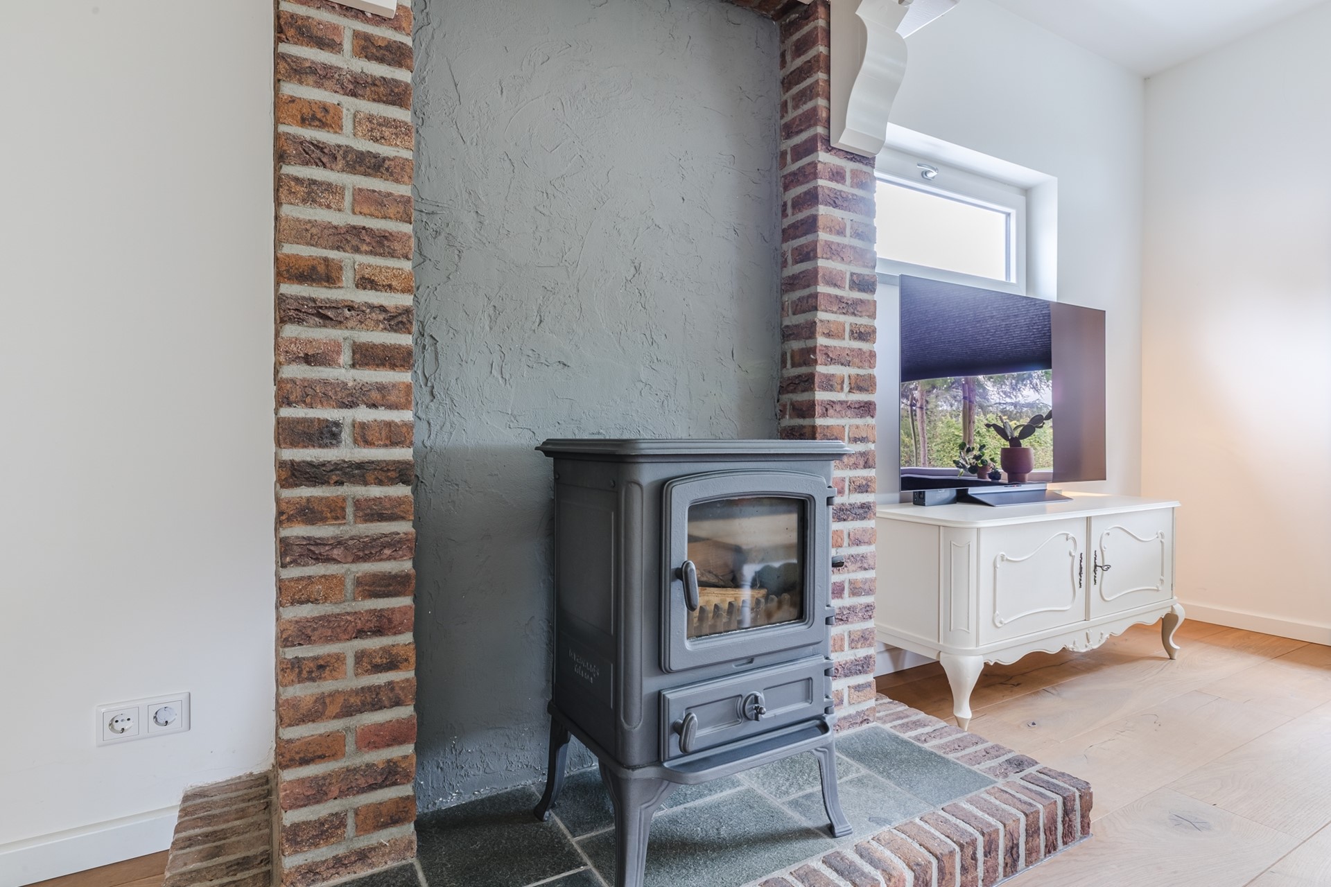 Hal met meterkast en trapopgang naar de 1e verdieping; gezellige L-vormige woonkamer met houtkachel en muurkast; gang; kantoortje; bijkeuken v.v. een keukenblok met wasbak en een inbouwkastenwand met witgoedaansluitingen; betegelde toiletruimte met wandcloset en fonteintje; sfeervolle leefkeuken v.v. een landelijke keukeninrichting met o.a. fornuis en een natuurstenen werkblad; via de overkapping heb je toegang tot de garage en de berging.