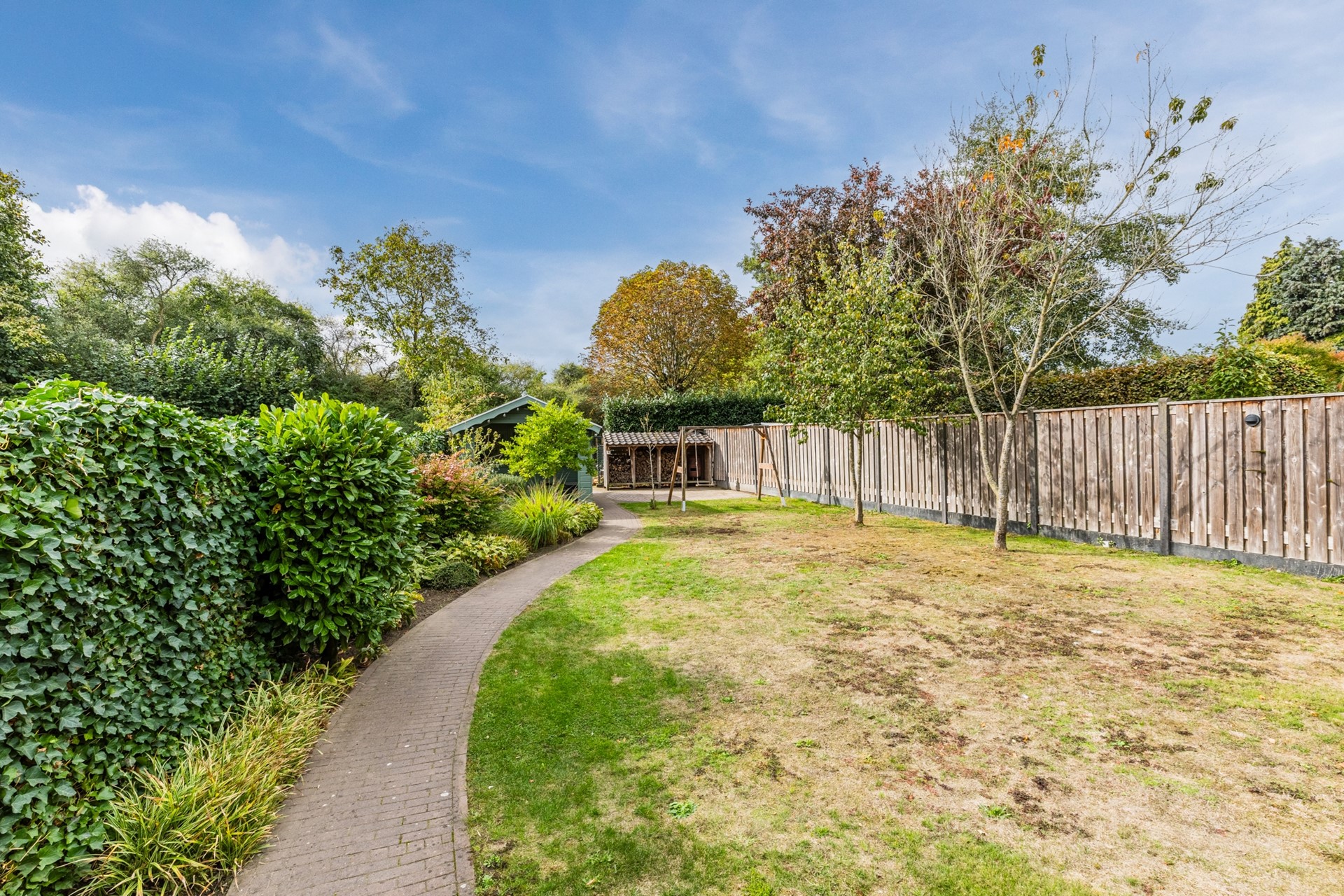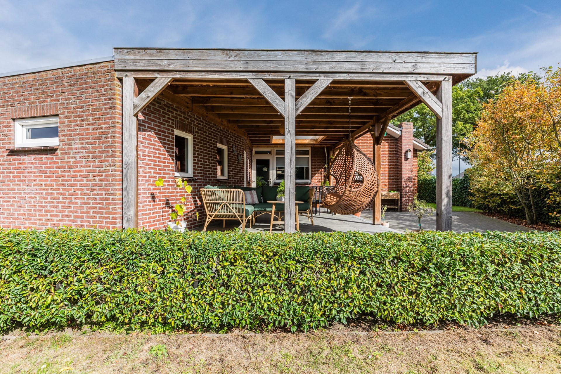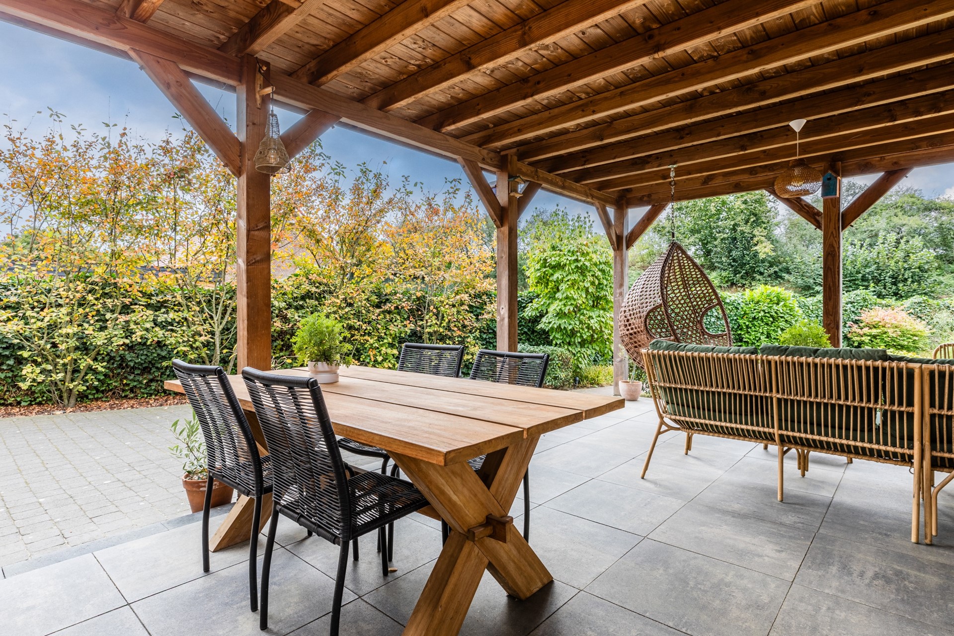 De voortuin is v.v. aanplant. Zowel links als rechts van de woning is plek voor het parkeren van meerdere auto's en/of een caravan of camper. Via een achterom aan de linkerzijde van de woning heb je toegang tot de geheel omheinde achtertuin. Een mooie houten overkapping zorgt ervoor dat je lekker lang buiten kunt zitten. Het tuinhuis, dierenverblijf, overkapping voor het opslaan van hout, trampoline en het schommelframe blijven allemaal achter.