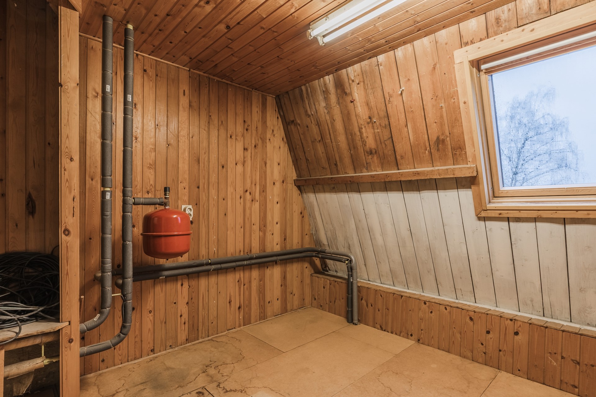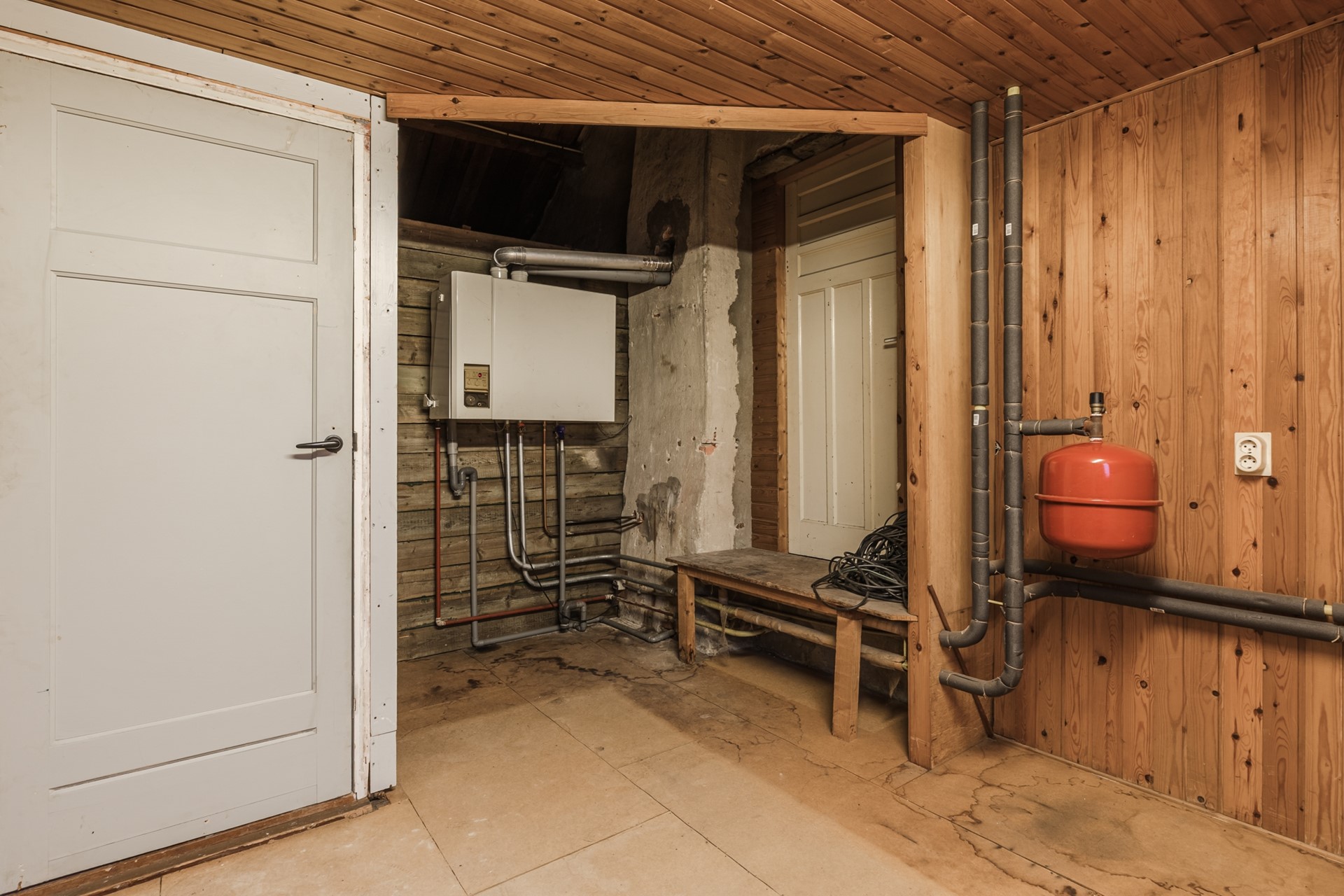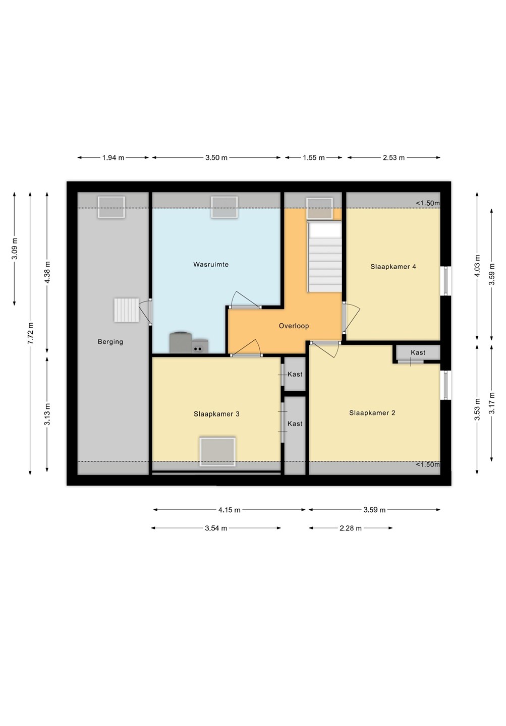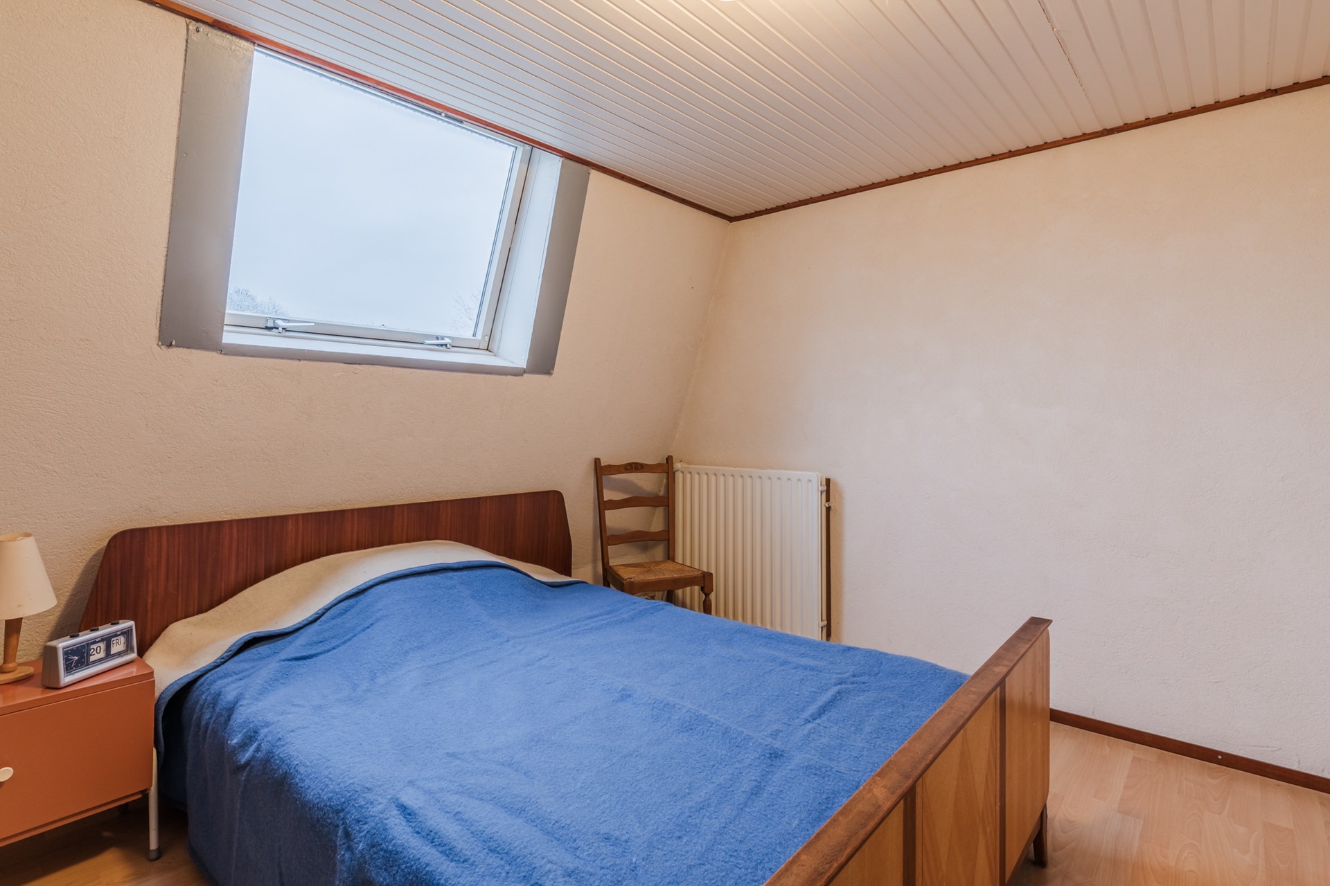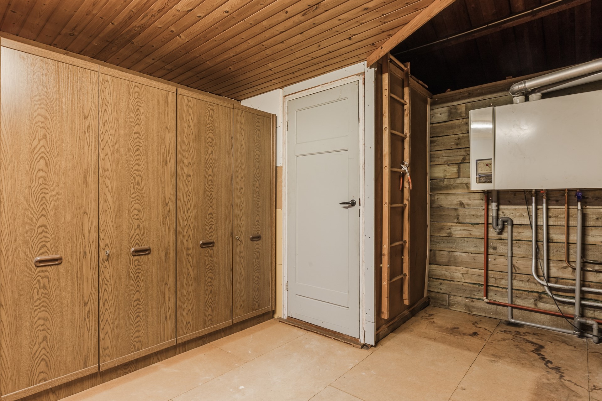 Overloop; 3 slaapkamers waarvan 2 met muurkast; berging met CV HR combiketel. Vanuit de ruimte heb je toegang tot de vliering; berging 2.