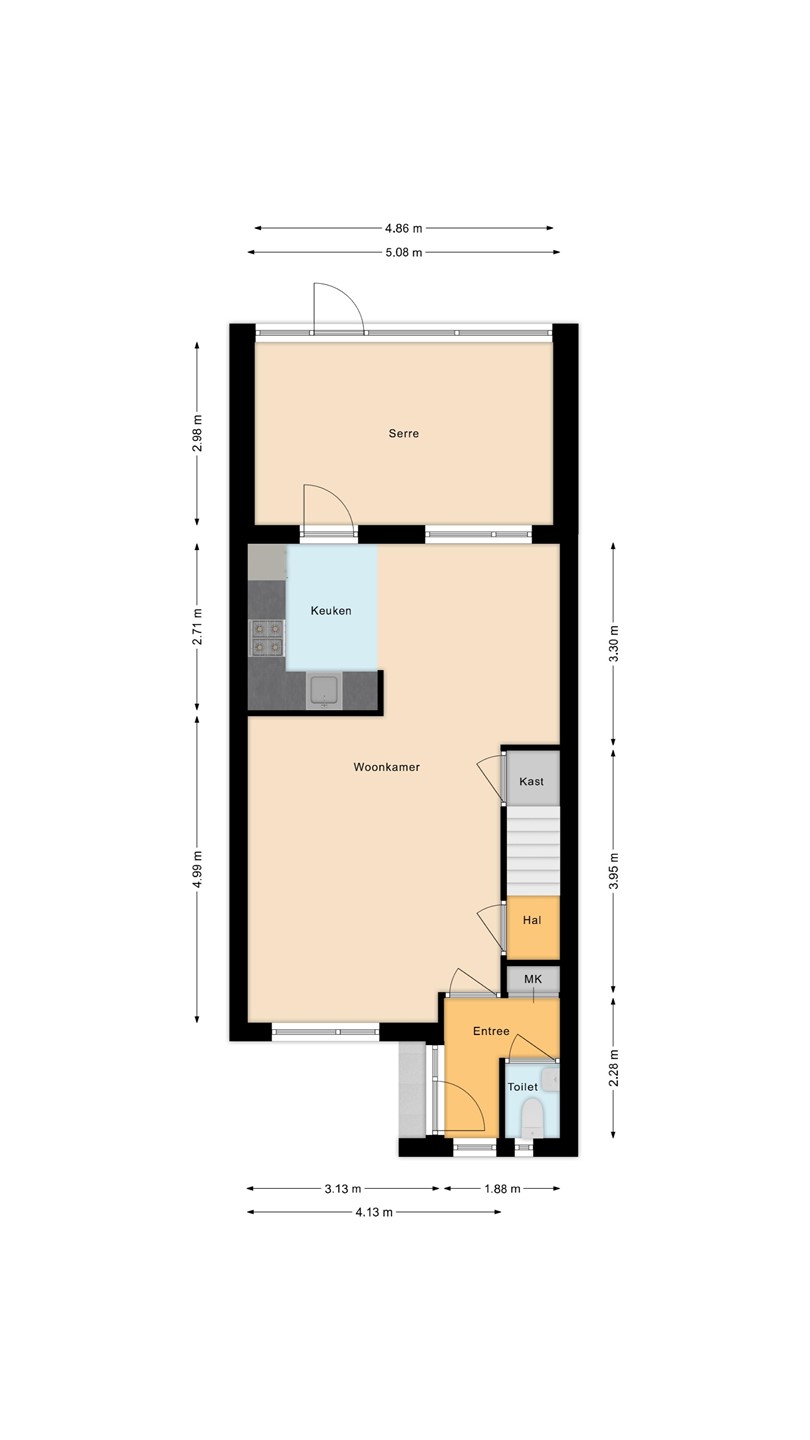 Hal met meterkast; betegelde toiletruimte met wc en fonteintje; lichte woonkamer in L-vorm. Vanuit de woonkamer heb je toegang tot de trapopgang naar de 1e verdieping, netjes weggewerkt achter een deur; trapkast; halfopen keuken v.v. een keukeninrichting in een hoekopstelling met inbouwapparatuur, waarvan de oven, vaatwasser en koelkast in 2025 vernieuwd zijn!; serre met toegang tot de tuin.