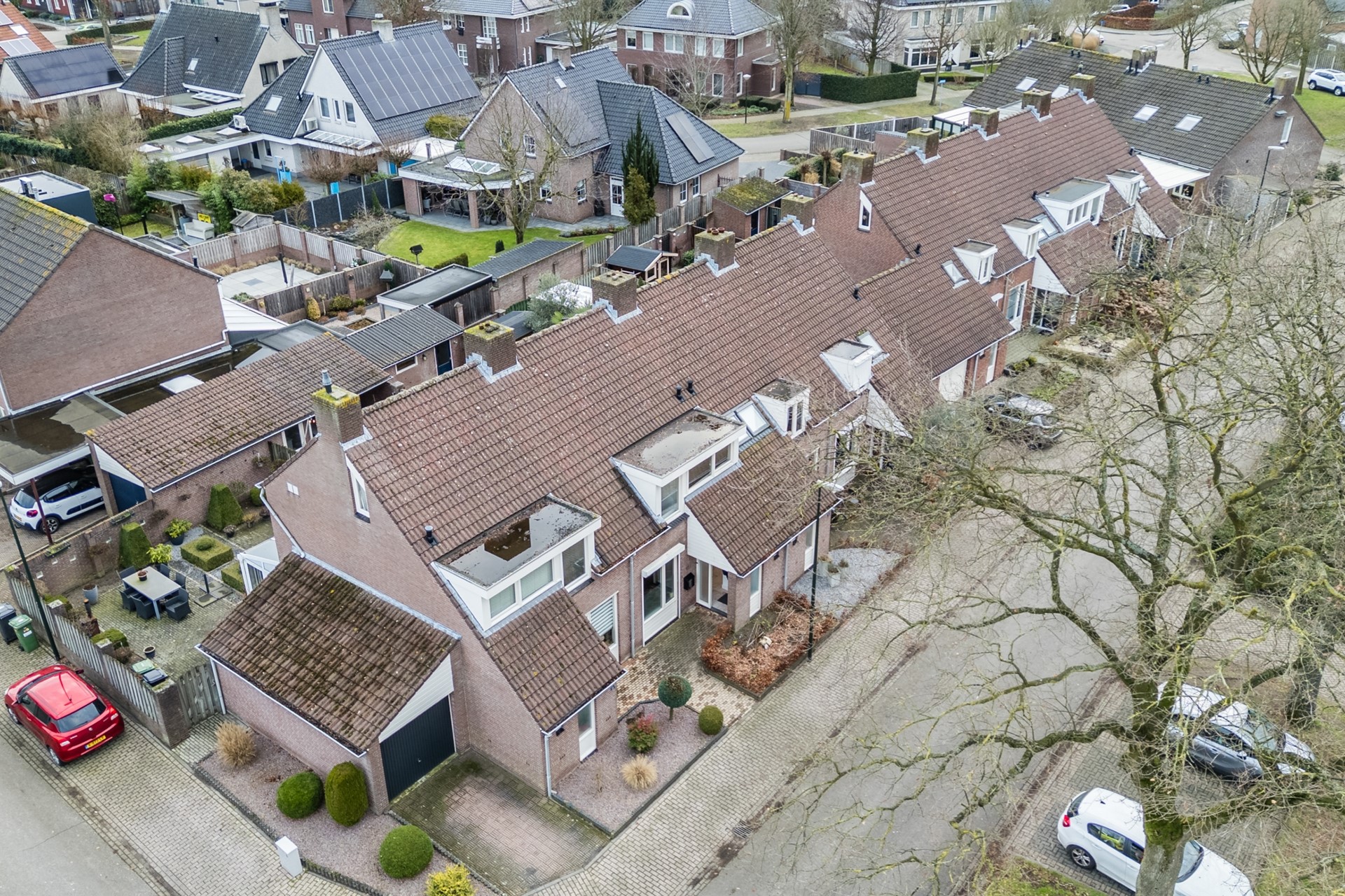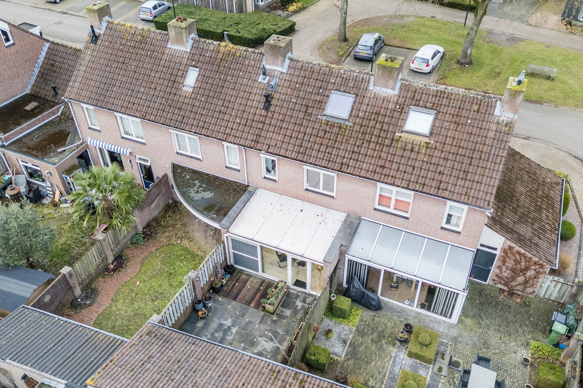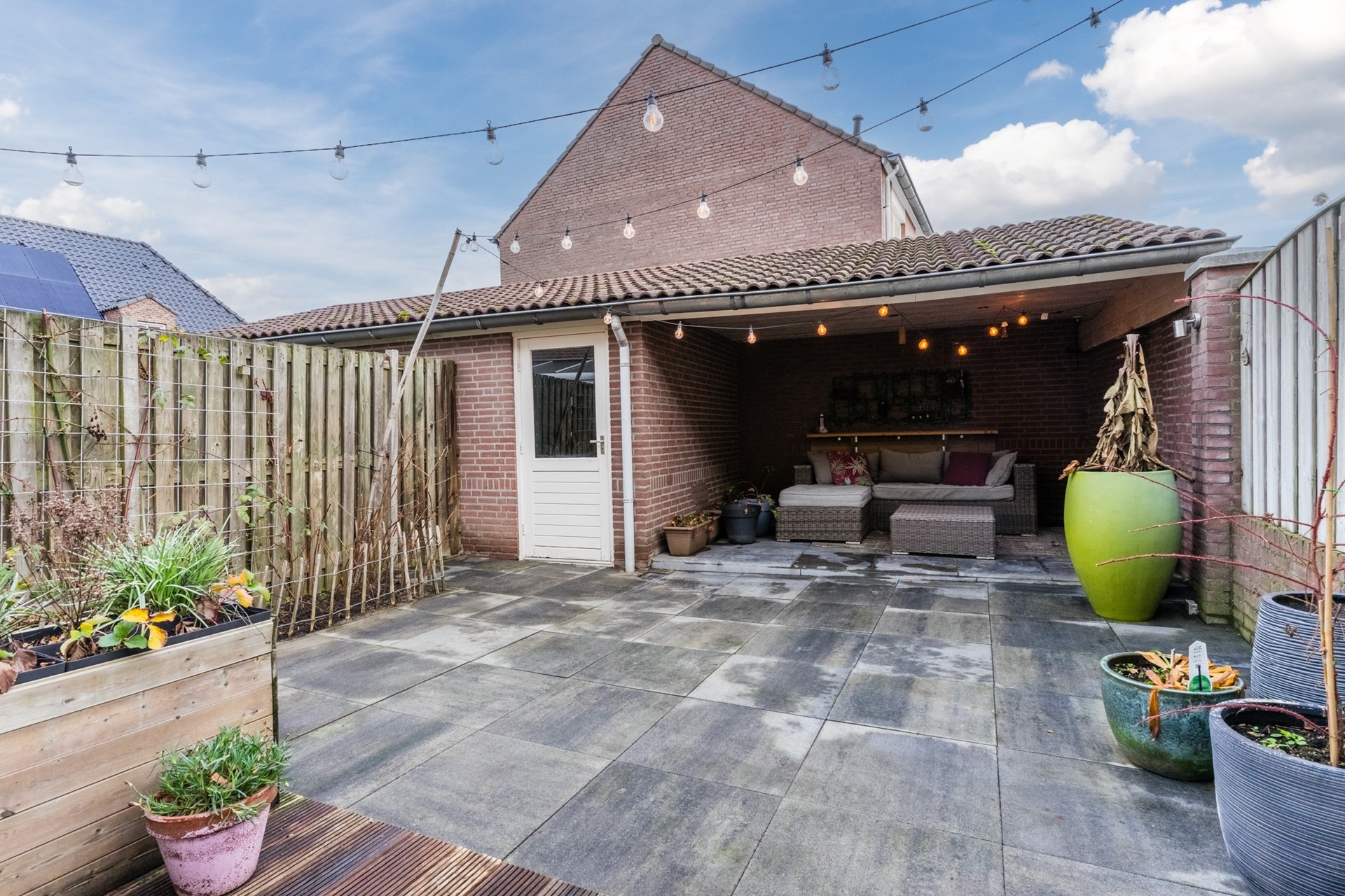 De voortuin is aangelegd met hagen en een border. De geheel omheinde achtertuin is onderhoudsvriendelijk aangelegd met groot terras, overdekt terras en borders. De vrijstaande garage heeft een oppervlakte van ca. 18 m². Door de aanwezige inrit voor de garage heb je de mogelijkheid om 1 auto op eigen terrein te parkeren, wel zo handig!