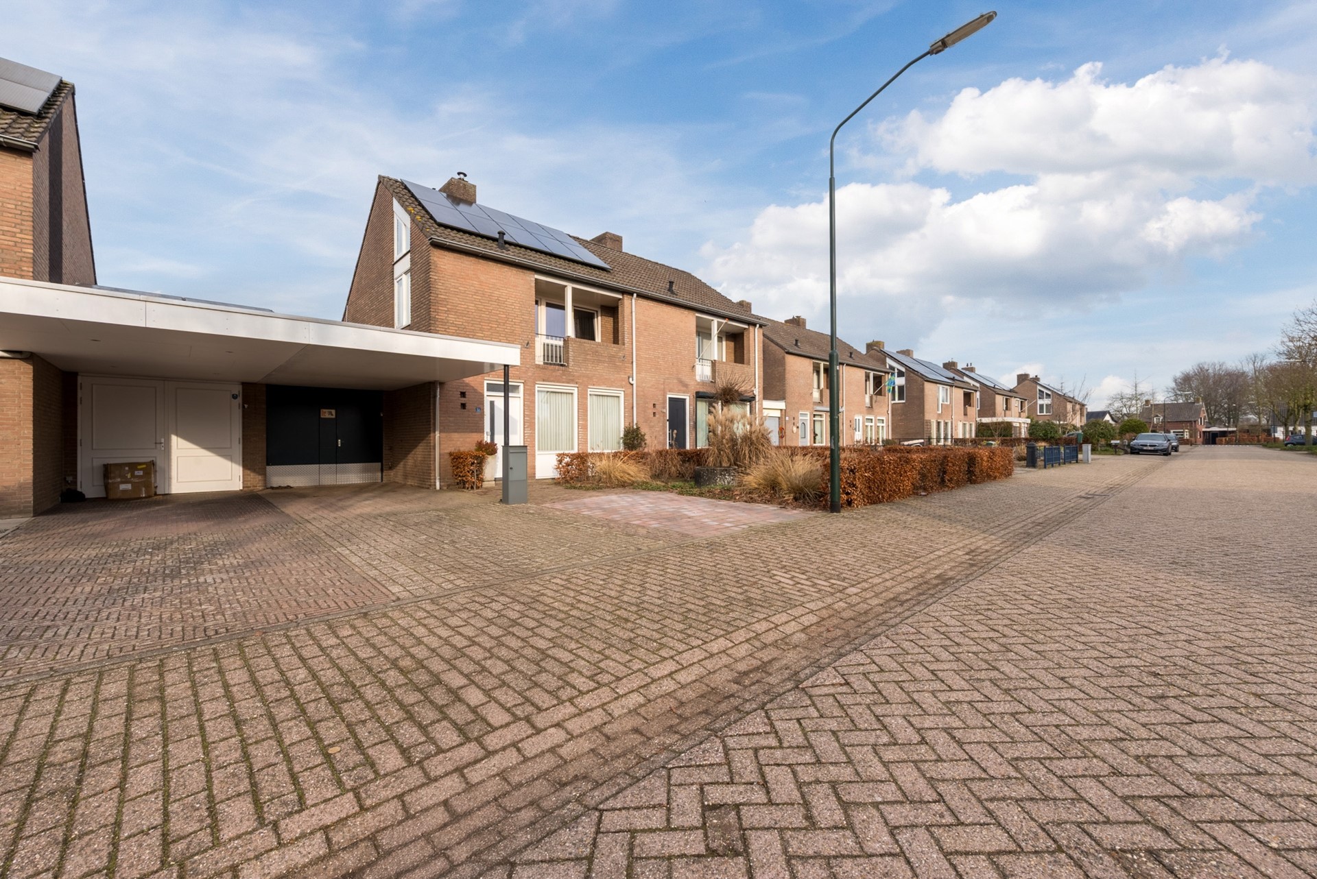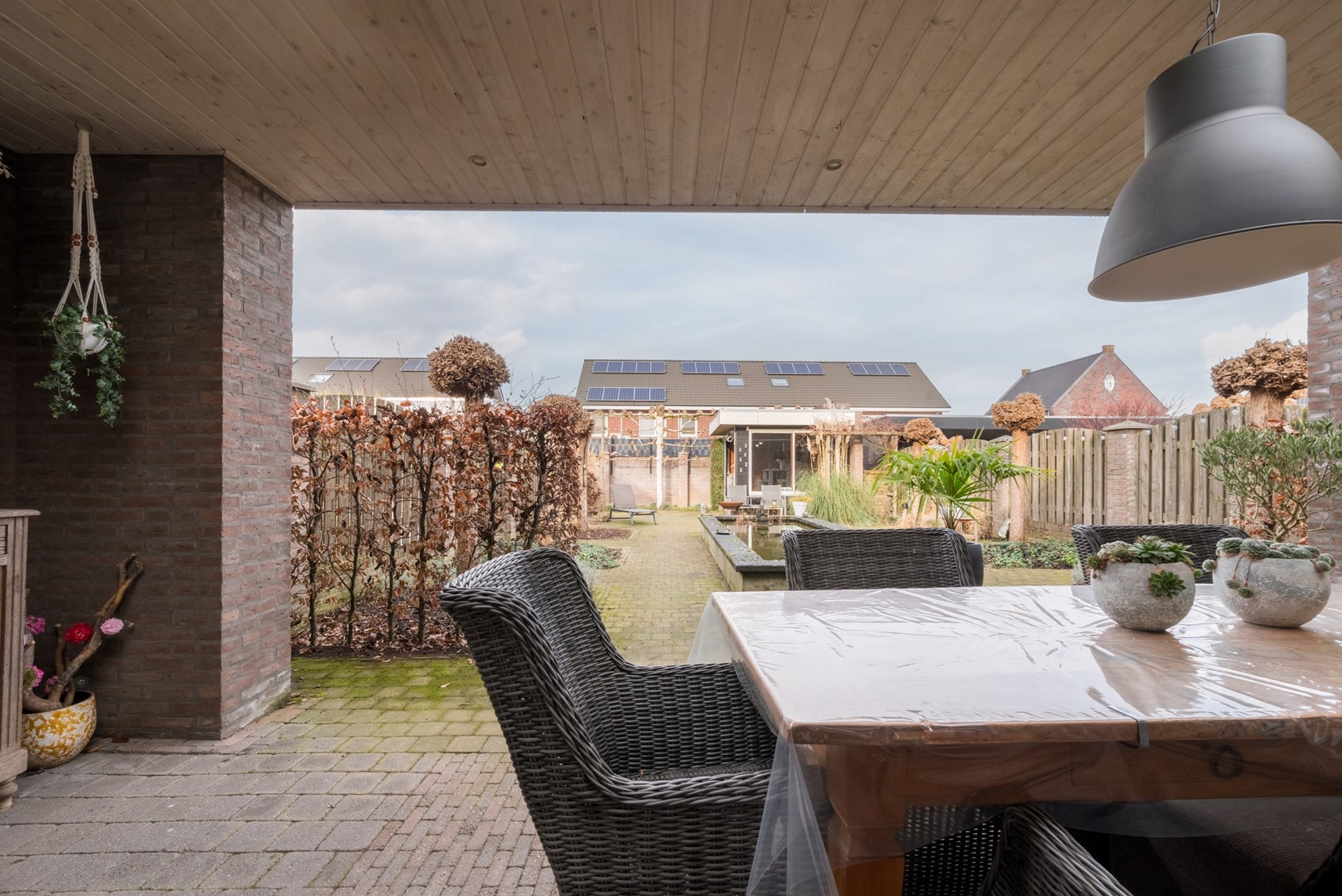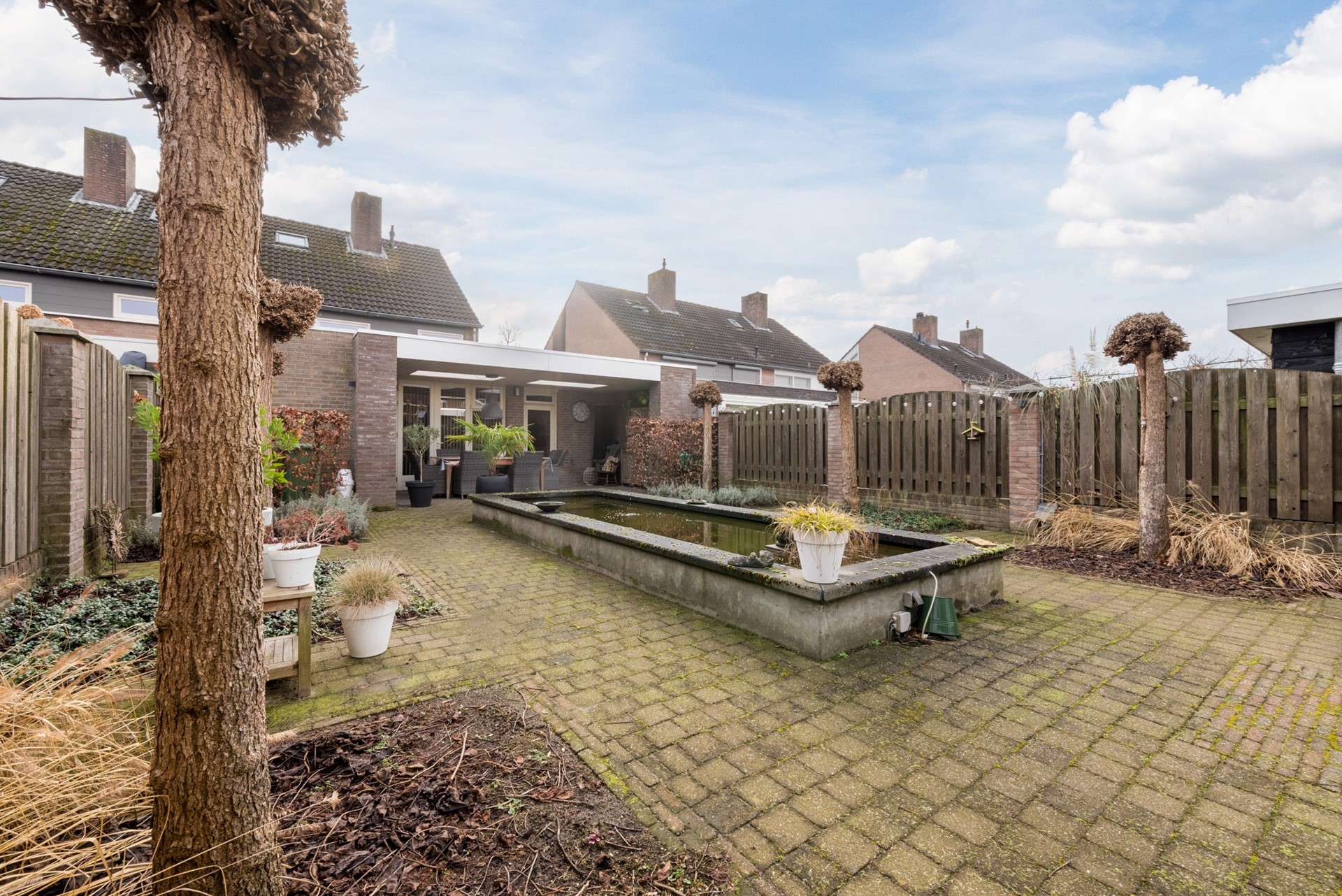 De voortuin is aangelegd met hagen en aanplant. Op de oprit met carport is er is plek voor het parkeren van 3 auto's. De diepe, geheel omheinde achtertuin beschikt over een royale overkapping aan de woning, vrijstaande overkapping (kan dicht gemaakt worden) en een extra vrijstaande berging. Verder is de achtertuin fraai aangelegd met een vijver, aanplant en bestrating.