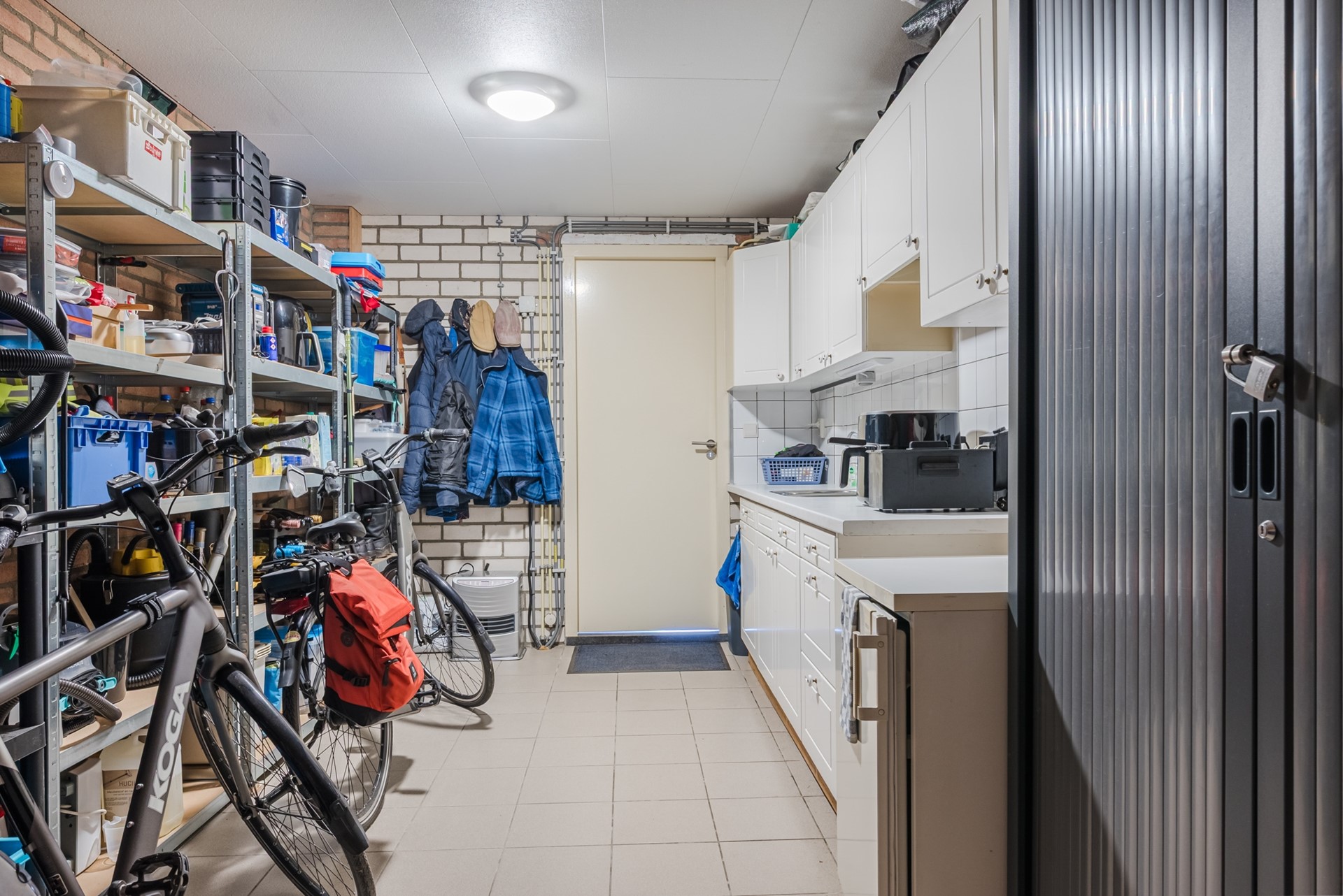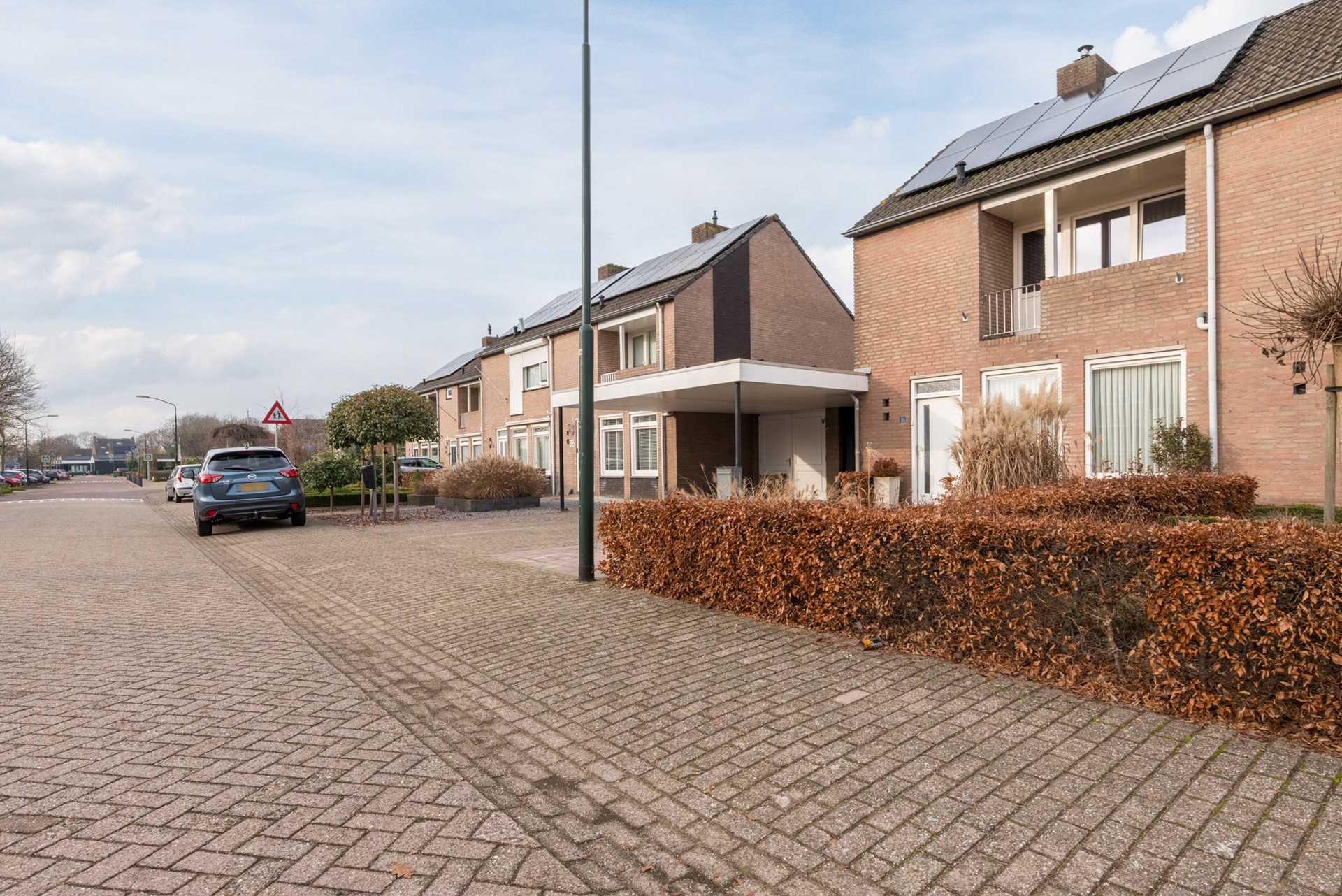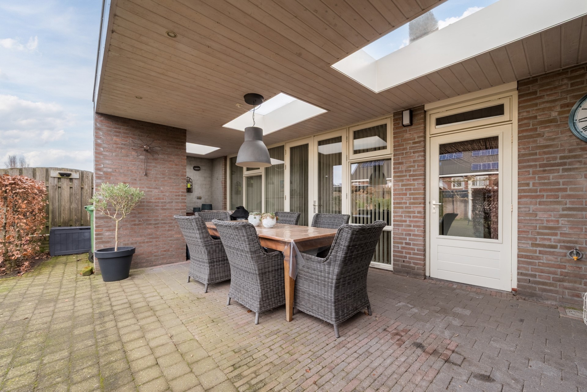 De voortuin is aangelegd met hagen en aanplant. Op de oprit met carport is er is plek voor het parkeren van 3 auto's. De diepe, geheel omheinde achtertuin beschikt over een royale overkapping aan de woning, vrijstaande overkapping (kan dicht gemaakt worden) en een extra vrijstaande berging. Verder is de achtertuin fraai aangelegd met een vijver, aanplant en bestrating.