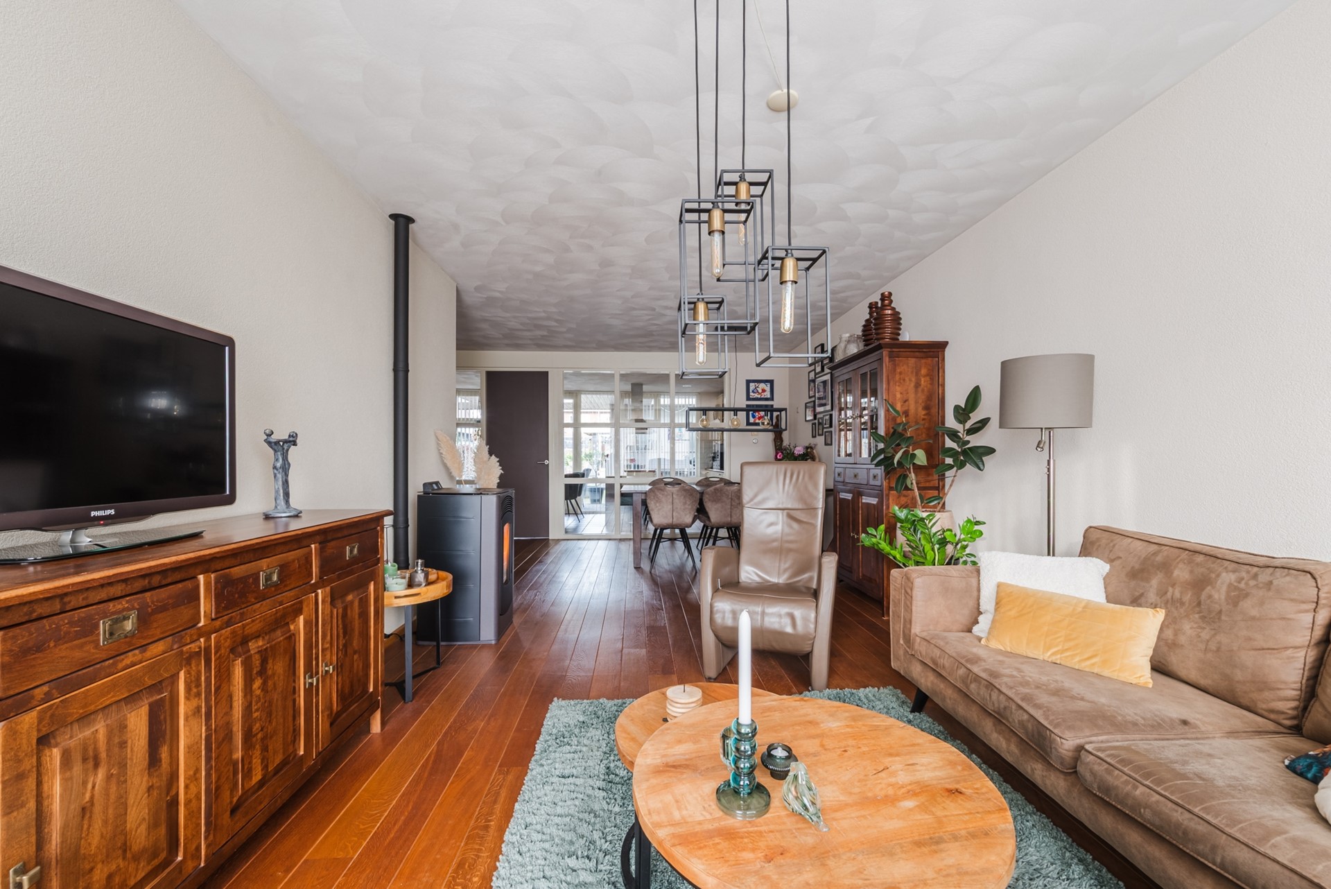 Hal met meterkast en trapopgang naar de 1e verdieping; trapkast; gezellige woonkamer in L-vorm met pellet kachel (ca. 2018) en een houten vloer; ruime leefkeuken v.v. een keukeninrichting met kookeiland en inbouwapparatuur. Vanuit de keuken heb je toegang tot het overdekte terras; bijkeuken met witgoedaansluitingen en eveneens toegang tot de tuin; betegelde toiletruimte met wandcloset en fonteintje; garage / berging v.v. een keukenblok.