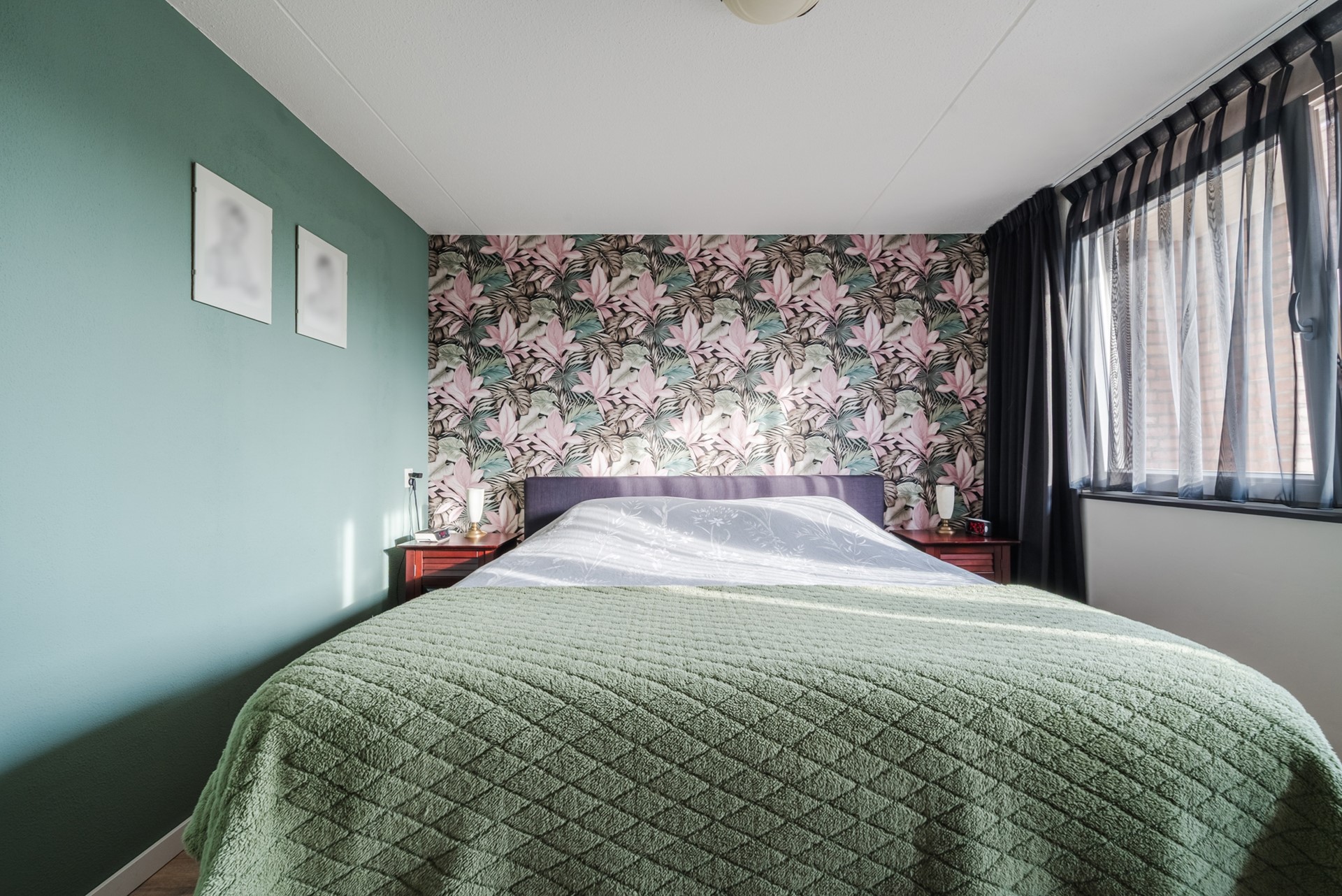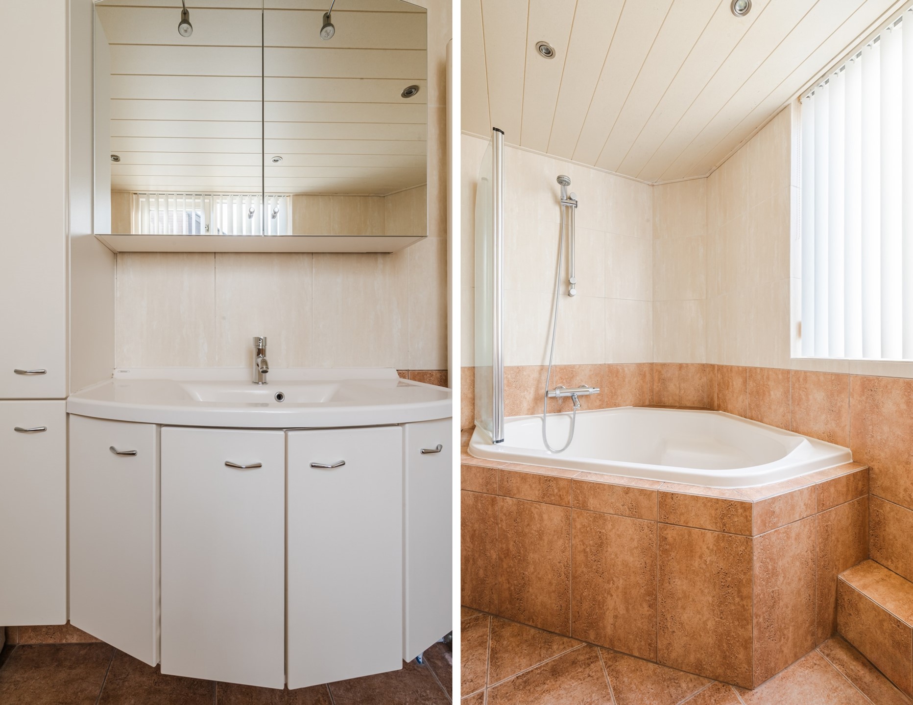Overloop met trapopgang naar de 2e verdieping; 3 slaapkamers. De slaapkamer aan de voorzijde heeft toegang tot de loggia. betegelde badkamer v.v. een bad- / douchecombinatie, meubel met wastafel en een wandcloset.