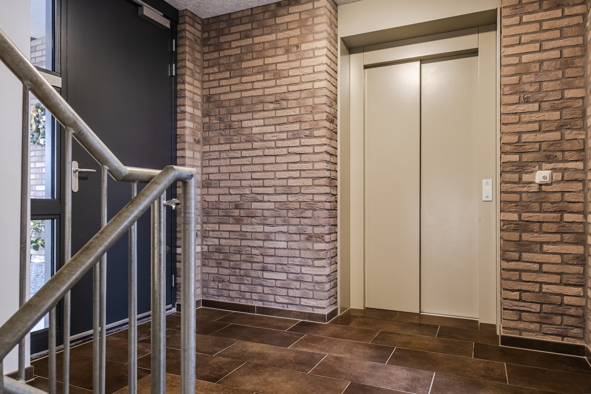 Entree van het complex met bellenplateau met video - intercom; centrale hal met trappenhuis en lift.